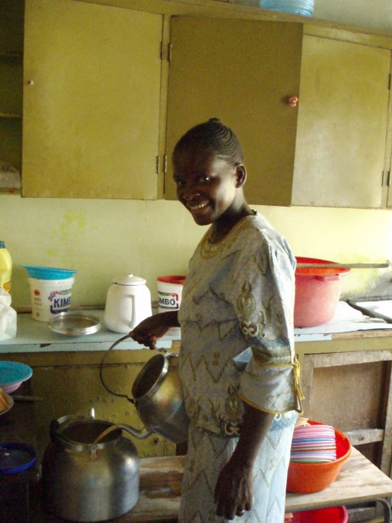 I am particularly fond of the women in the kitchen–Christine, Margaret and Beatrice. (They are not deaconesses, but women hired to feed about forty of us gathered for a conference on HIV/AIDS and mercy). They lovingly prepare tea and our meals in a very hot, tiny kitchen over wood burning little BBQs. They have a sweetness about them that is infectious. Some of my most joyous times have been connecting with them! I learned how to make chai tea: boil water; add milk and bring to a boil; add tea (finely ground ginger tea), then sugar to taste…