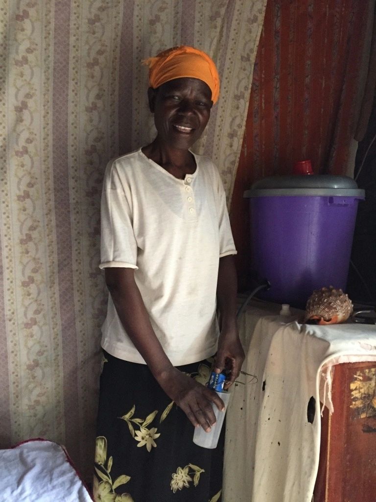 Ann, a widow caring for seven people, including two orphans and two grandchildren, in her teeny tiny home in Kibera. Ann was given a water filter in 2014 and it is still working well. She reports a drastic decrease of abdominal pain, diarrhea and other illnesses in this two- year span.