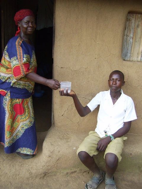 Selina giving water to her son, John, who calls it “mama’s water”. Selina’s source of water is river water and well water which are both unsafe for drinking. Thanks to the use of the filter, she now drinks clean water, thus reducing cost of treatment for water borne diseases, and the cost of fuel to boil water.