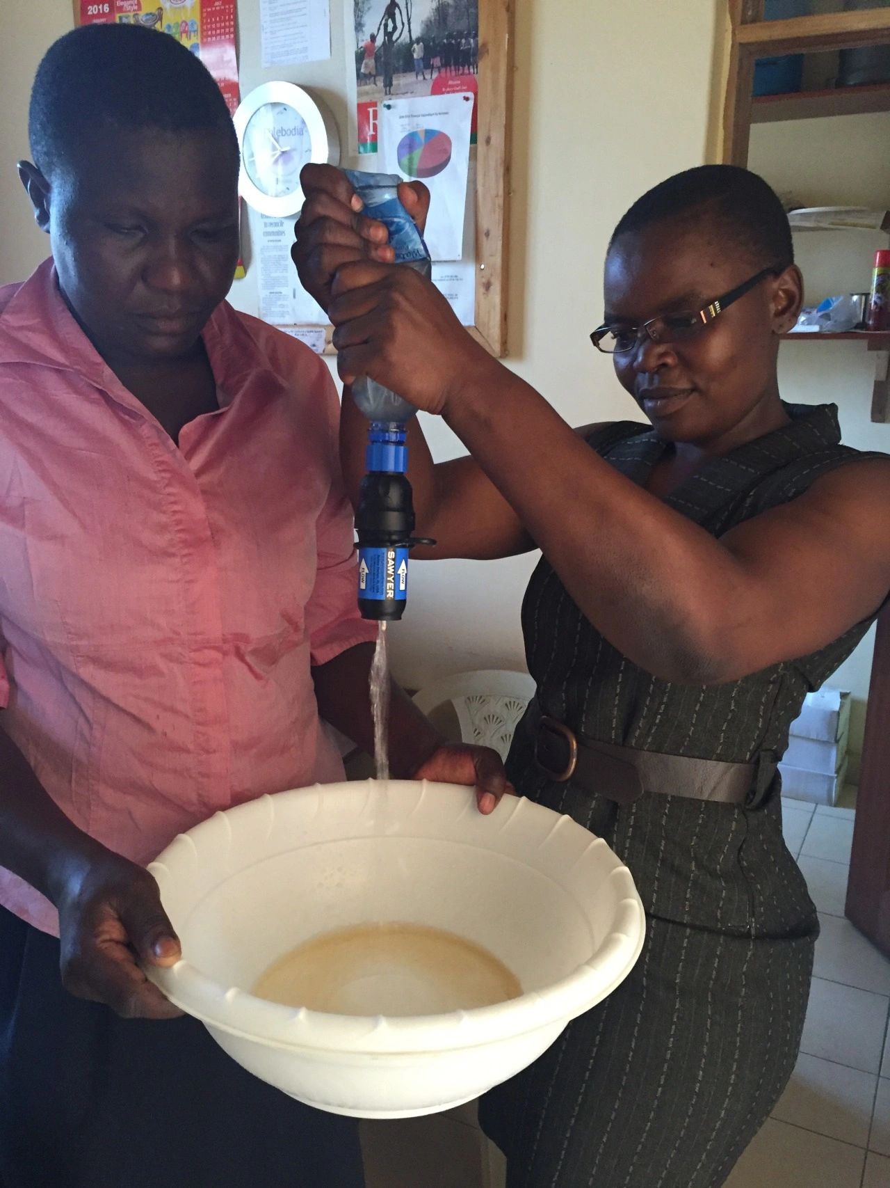 Linder demonstrating the use of the blue fitting and water bottle as an alternative means of cleaning the filter. Vicky assisting.